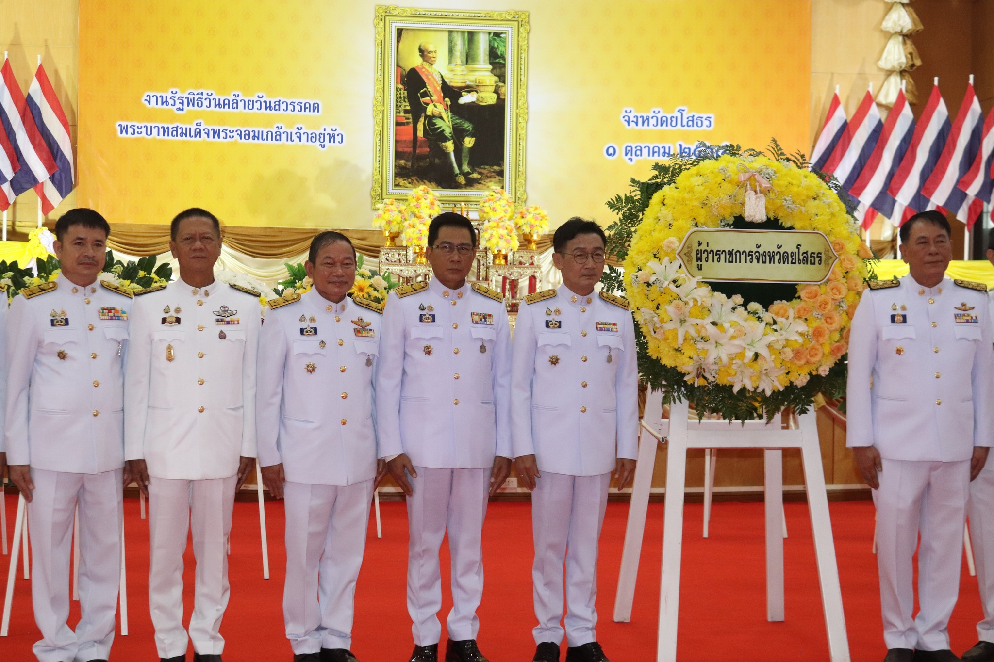 นายชาญชัย ศรศรีวิชัย ผู้ว่าราชการจังหวัดยโสธร เป็นประธานนำ ข้าราชการตุลาการ ข้าราชการพลเรือน ทหาร ตำรวจ เหล่ากาชาดจังหวัดยโสธรพนักงานรัฐวิสาหกิจ ผู้บริหารองค์กรปกครองส่วนท้องถิ่น องค์กรภาคเอกชน และประชาชนชาวจังหวัดยโสธร ทุกหมู่เหล่า ร่วมประกอบพิธีวางพวงมาลาถวายราชสักการะ จุดเครื่องทองน้อย และกล่าวคำถวายราชสดุดีเทิดพระเกียรติ เบื้องหน้าพระบรมสาทิสลักษณ์พระบาทสมเด็จพระจอมเกล้าเจ้าอยู่หัว เนื่องในวันที่ระลึกพระบาทสมเด็จพระจอมเกล้าเจ้าอยู่หัว 1 ตุลาคม 2568 โดยในการนี้ นายณัฐพล นาคสุข นายกเทศมนตรีเมืองยโสธร ได้มอบหมายให้ นายสุธา บรรตานึก รองนายกเทศมนตรีเมืองยโสธร นำเจ้าหน้าที่ และพนักงานเทศบาลเมืองยโสธร เข้าร่วมพิธี ณ หอประชุมจังหวัดยโสธร ศาลากลางจังหวัดยโสธร งานประชาสัมพันธ์ เทศบาลเมืองยโสธร โทร 045-711397 ต่อ 310
