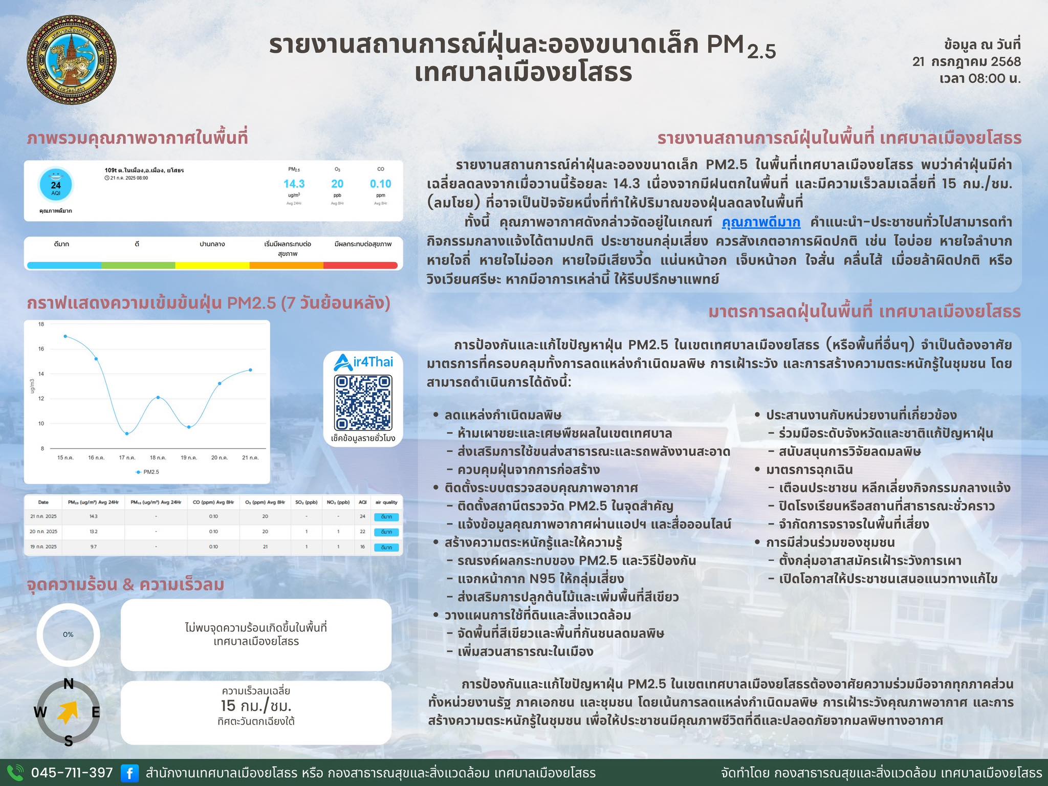 รายงานสถานการณ์ฝุ่นละอองขนาดเล็ก PM 2.5 เทศบาลเมืองยโสธร ประจำเดือนกรกฎาคม 2568